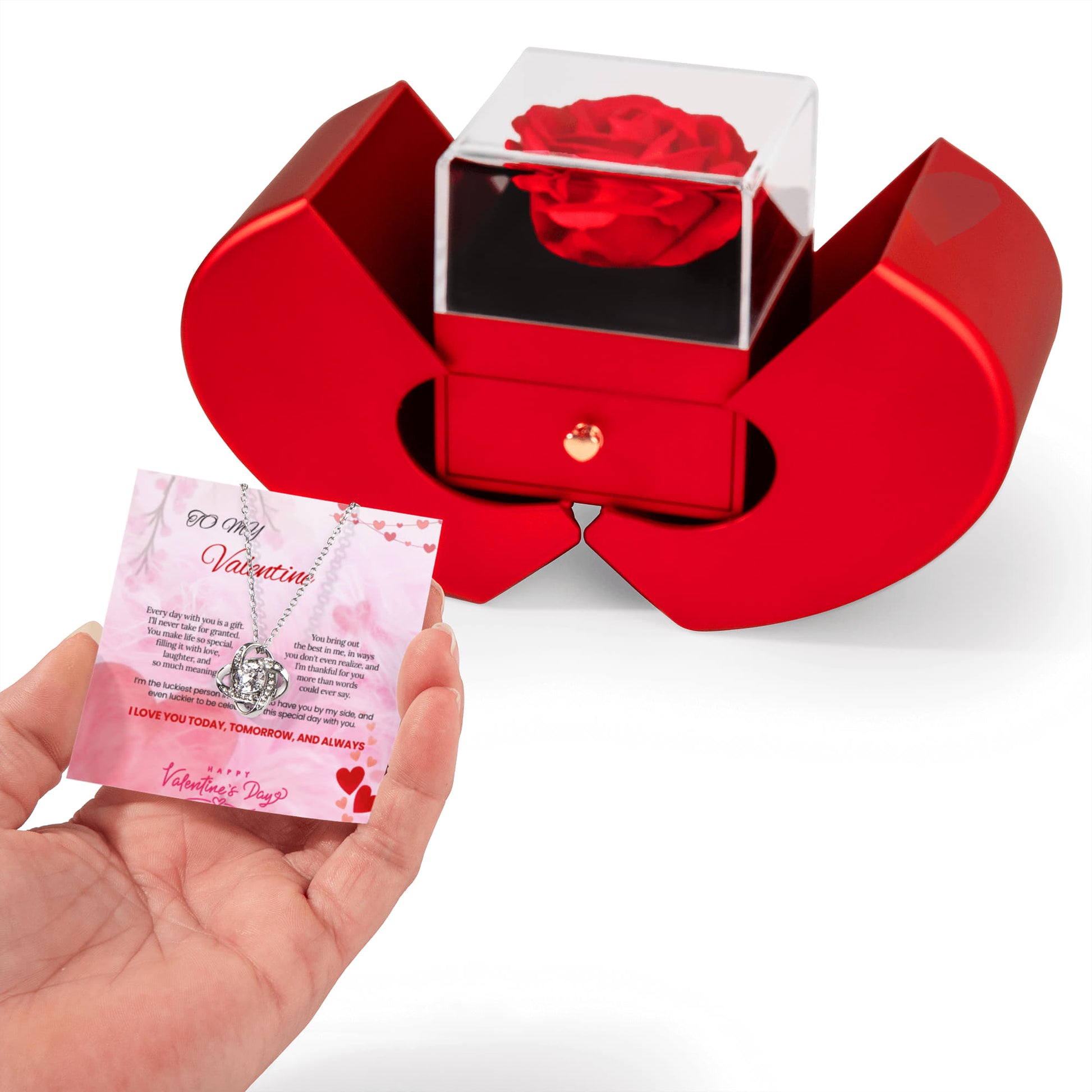 Create an unforgettable gifting experience with our elegant Rose and Love knot Necklace Gift Set, complete with a festive greeting card. The everlasting Rose symbolizes eternal love, while the sparkling Love knot Necklace serves as the perfect token of your love. Ideal for birthdays, marriage proposals, Mother's Day, Valentine's Day, or any special occasion, this beautiful package is guaranteed to make your loved one feel truly cherished and appreciated.